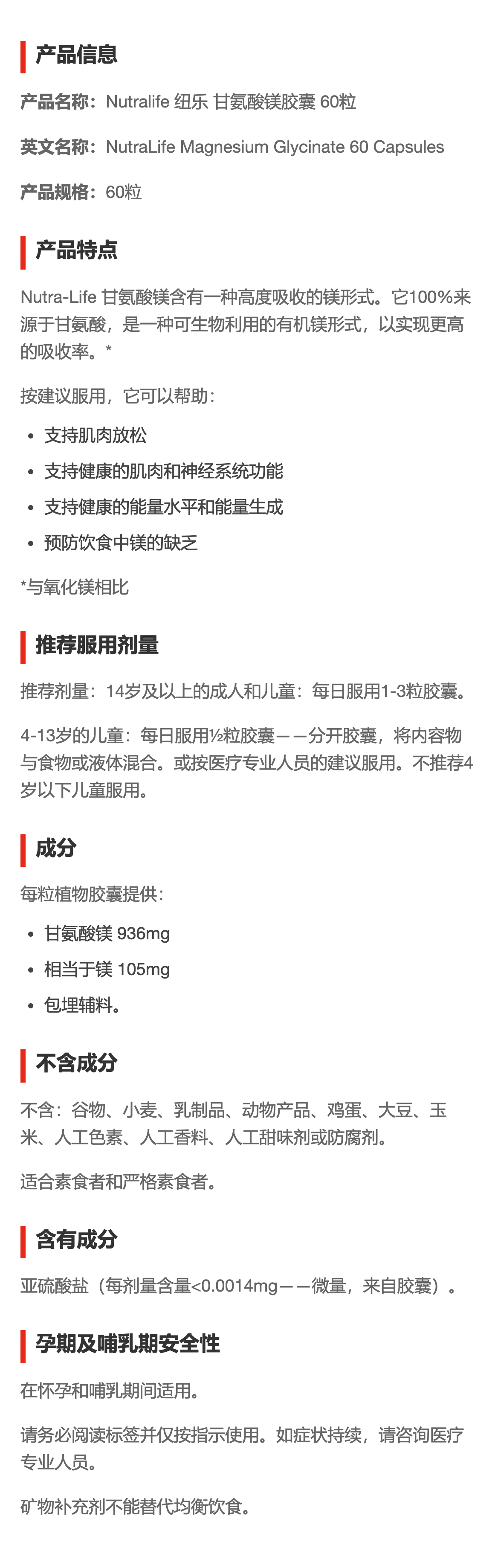 Nutralife 纽乐 甘氨酸镁胶囊Magnesium Glycinate 60粒