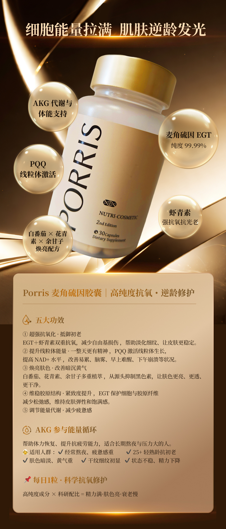 Naturies 奈氏力斯旗下品牌 Porris 麦角硫因 25mg 30粒 含PQQ+虾青素+余甘子+白番茄